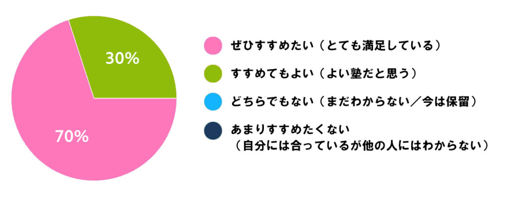佐藤塾への全体的な満足度をお聞きしたところ、「とても満足している」「満足している」と回答された方が全体100%を占めました。